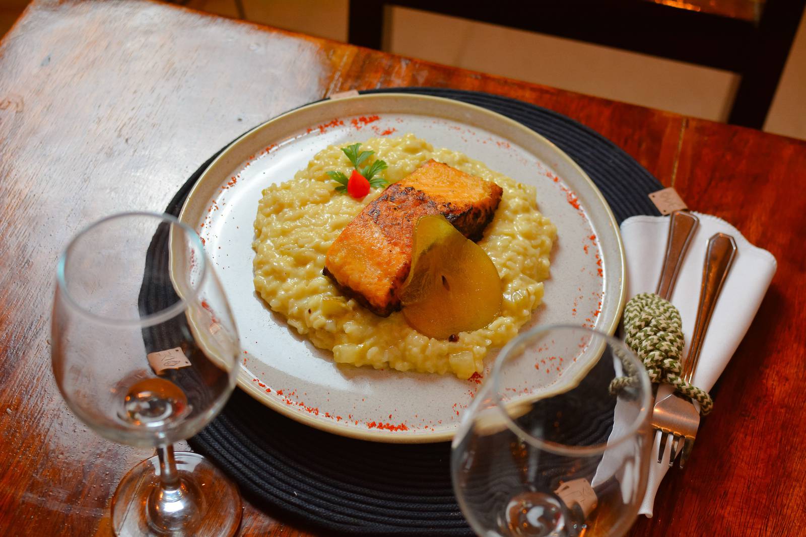 Risoto de Pera e Gorgonzola com Salmão Grelhado