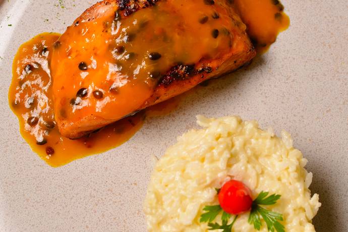 Salmão grelhado ao molho de maracujá e manga, acompanha arroz cremoso de parmesão.