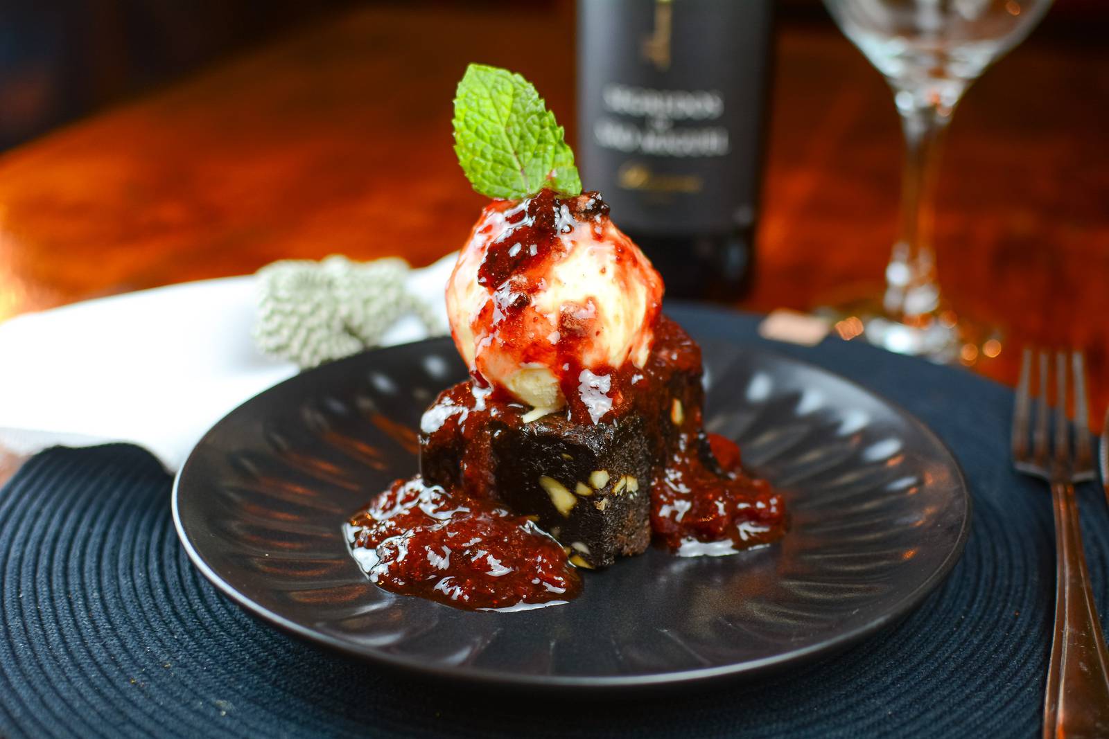 Brownie quentinho com castanhas, cremosidade do sorvete e o frescor perfumado do hibisco com morango. Uma sobremesa que aquece e refresca.