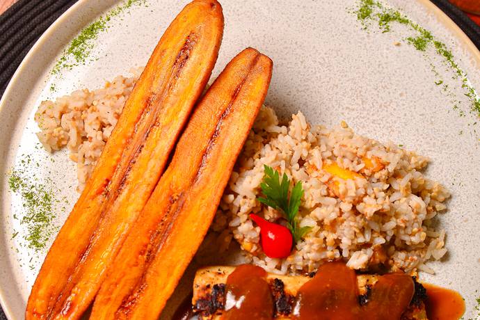 Peixe ao molho cítrico com banana e castanha, acompanha arroz.