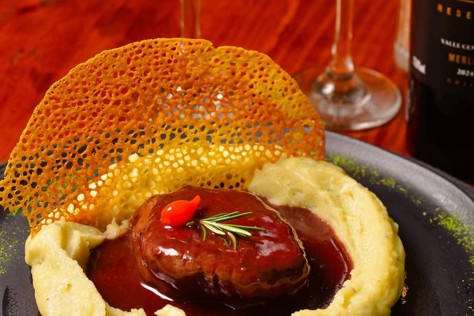 Filé Mignon ao molho de Jabuticaba, acompanha purê de batata com gorgonzola.