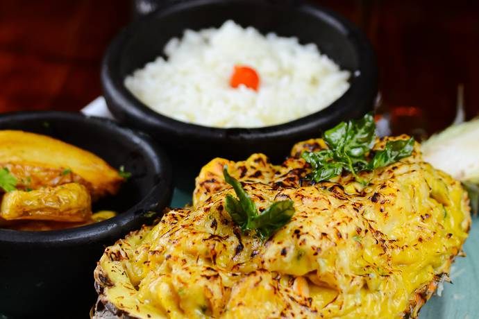 Camarão ao molho de abacaxi, catupiry e queijo parmesão maçaricado, acompanha batata rústica e arroz.