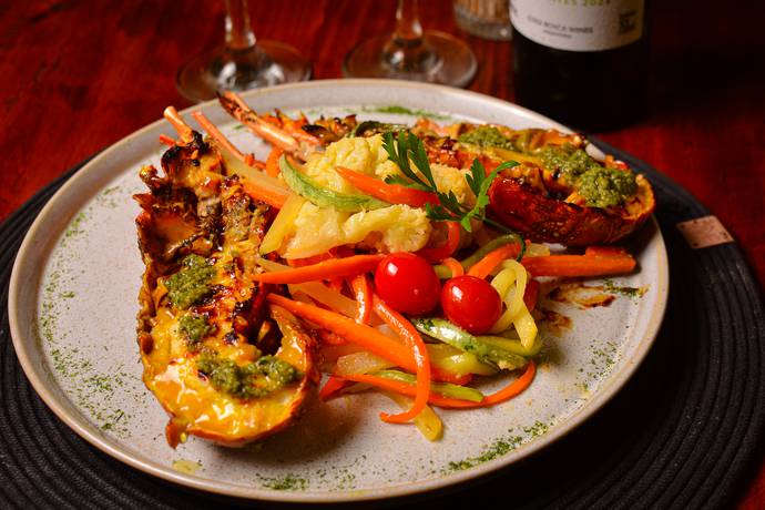 Lagosta grelhada ao molho de ervas provençal e acompanha legumes salteados e arroz.