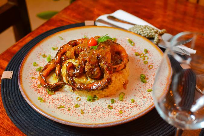 Polvo flambado no conhaque com mostarda e mel, acompanha arroz enriquecido com leite de coco, castanhas e cubos e banana da terra frita.